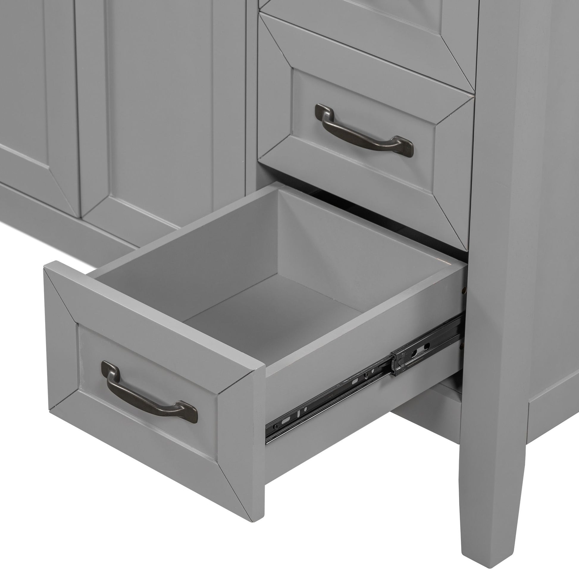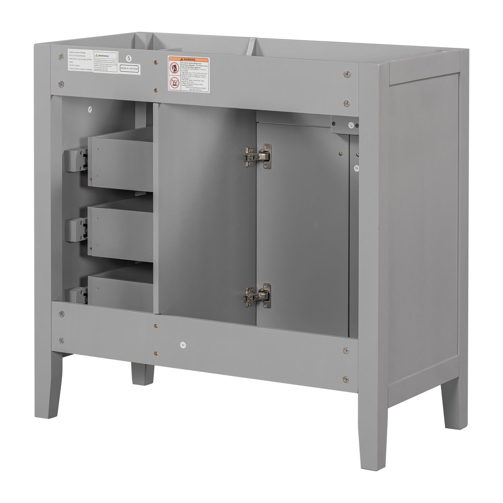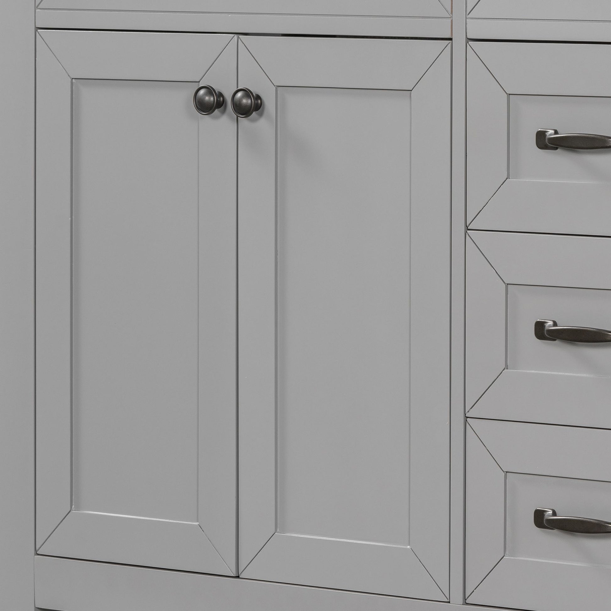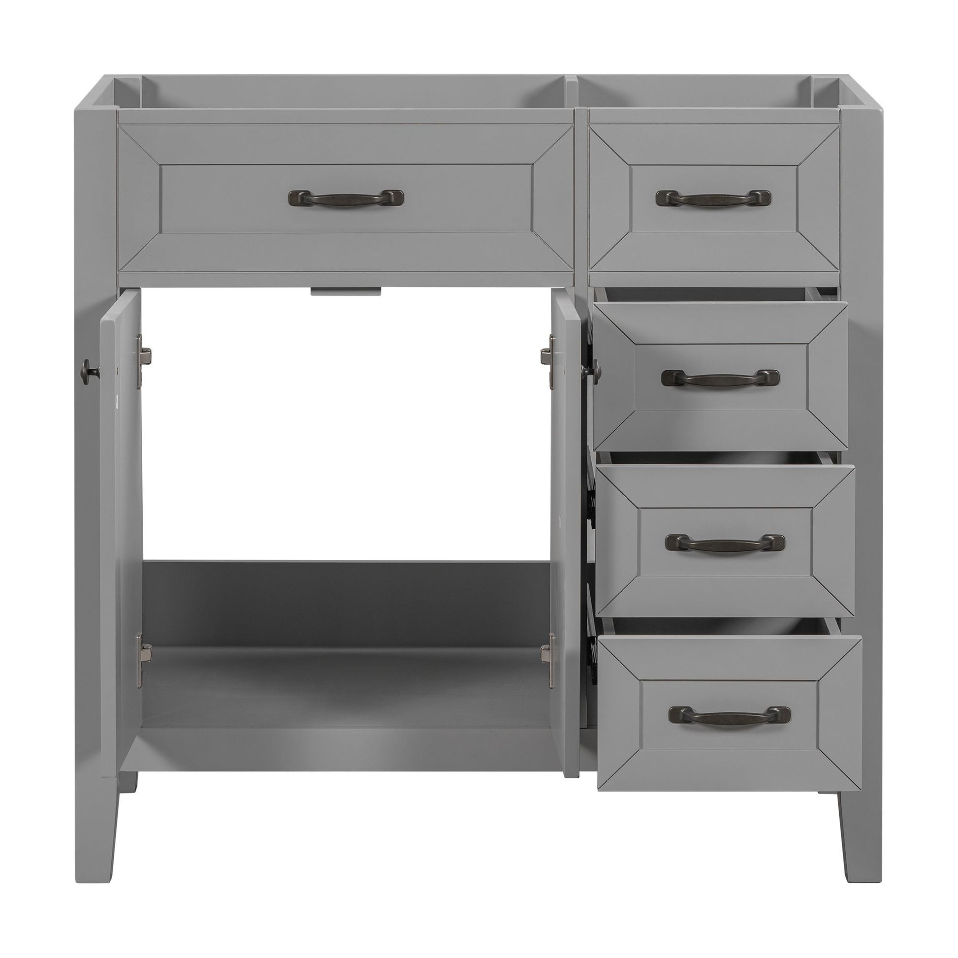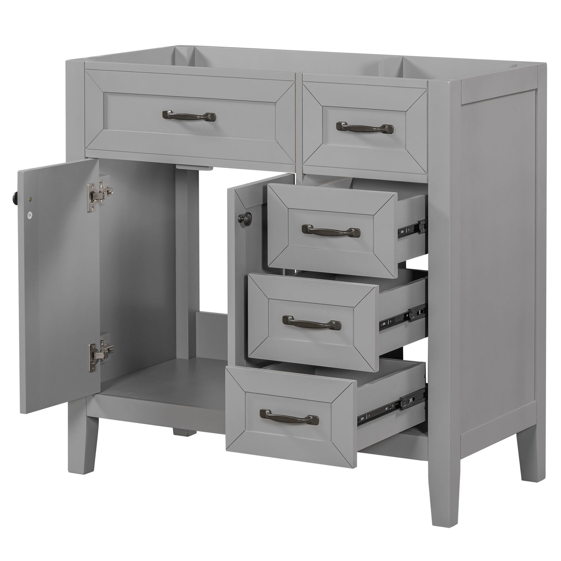 Stylish 36" Bathroom Vanity Base Only: This 36" bathroom vanity is suitable for bathroom in any decoration style. Freestanding grey vanity cabinet with black handles complies with your bathroom facilities. The groove design on the door and drawer increases the artistry and aesthetics of the home environment. If you're looking for a simple but stylish bathroom sink vanity, our product will be a great choice to upgrade your bathroom.