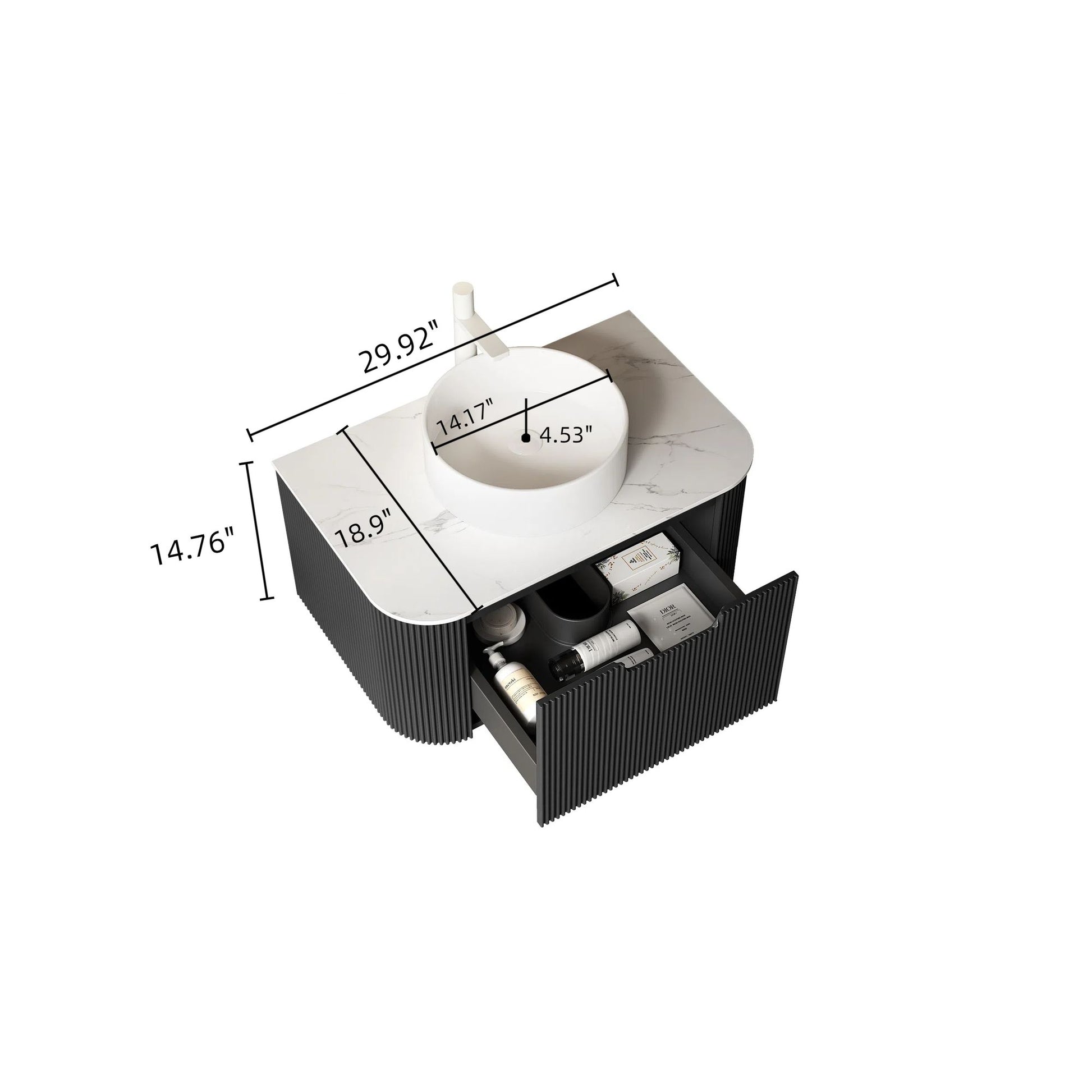 The cabinet is made of 18mm thick high-strength plywood, which has excellent water and moisture resistance, not easy to be deformed or moldy even in a humid bathroom environment for a long time.The drawer panels featuring 3D French-style striped with matte black waterproof paint, which make it understated, versatile and never goes out of style.*Please noted that the cabinet panel may have different color and grain pattern under the different light.
