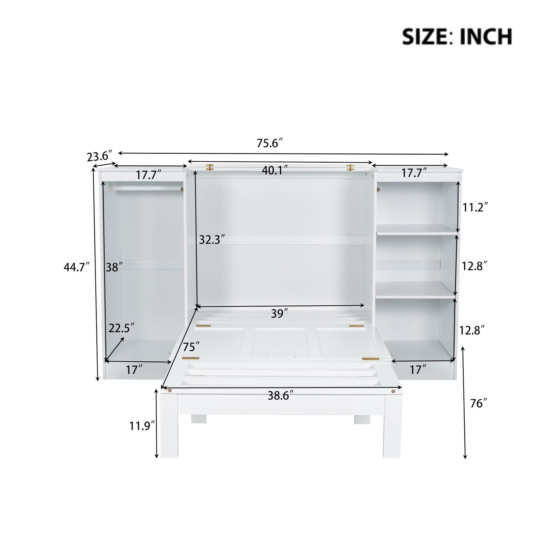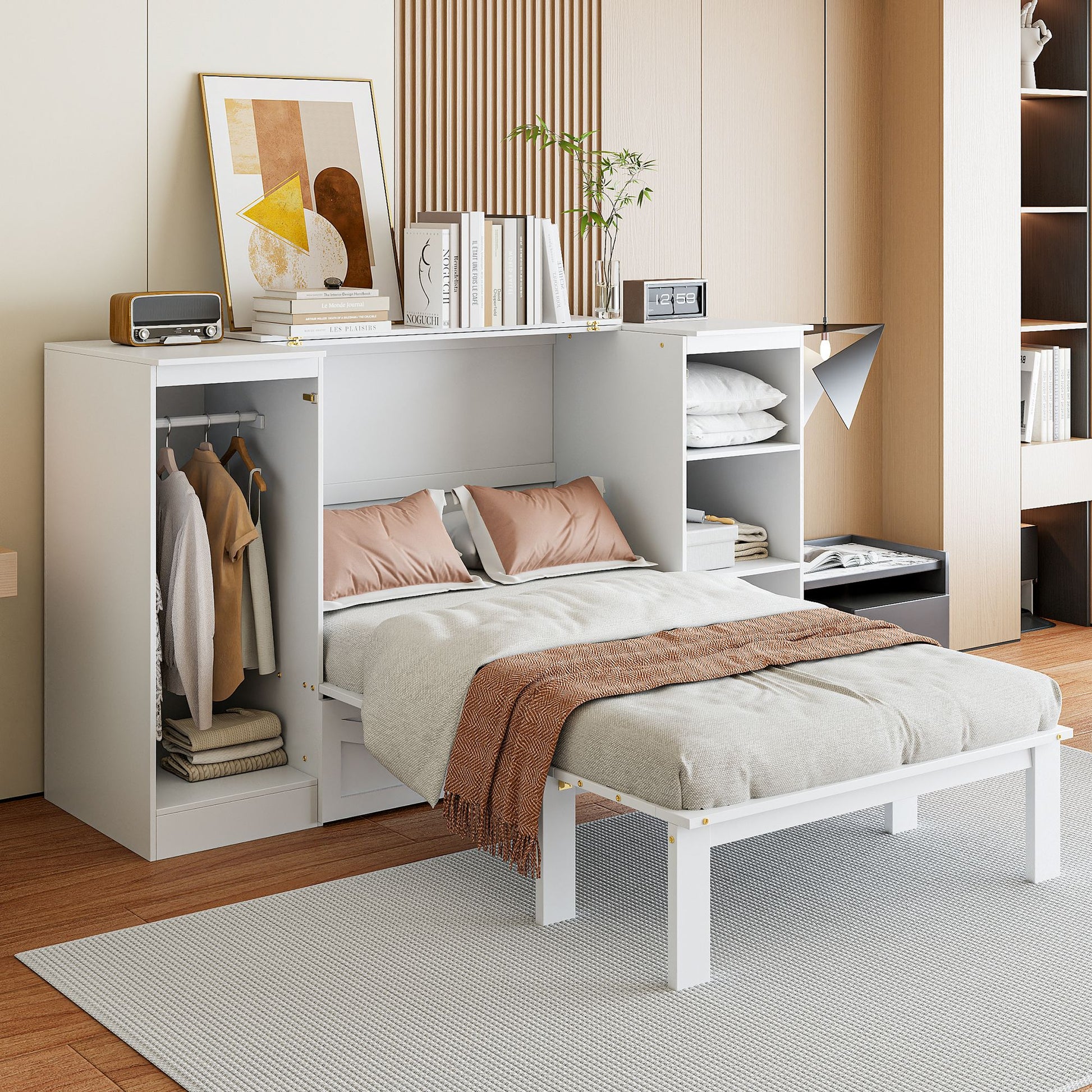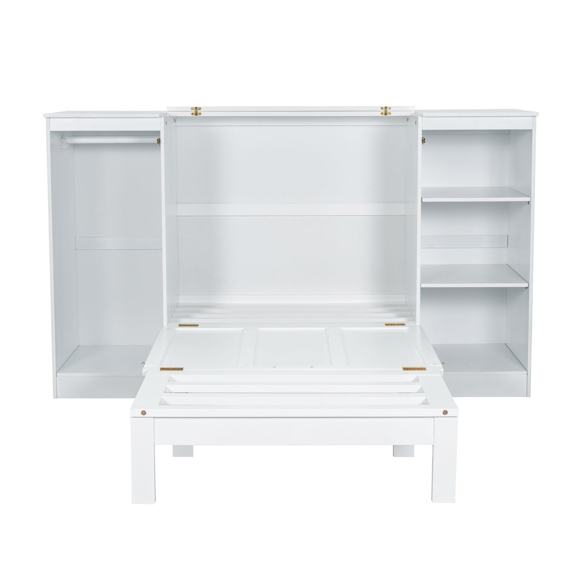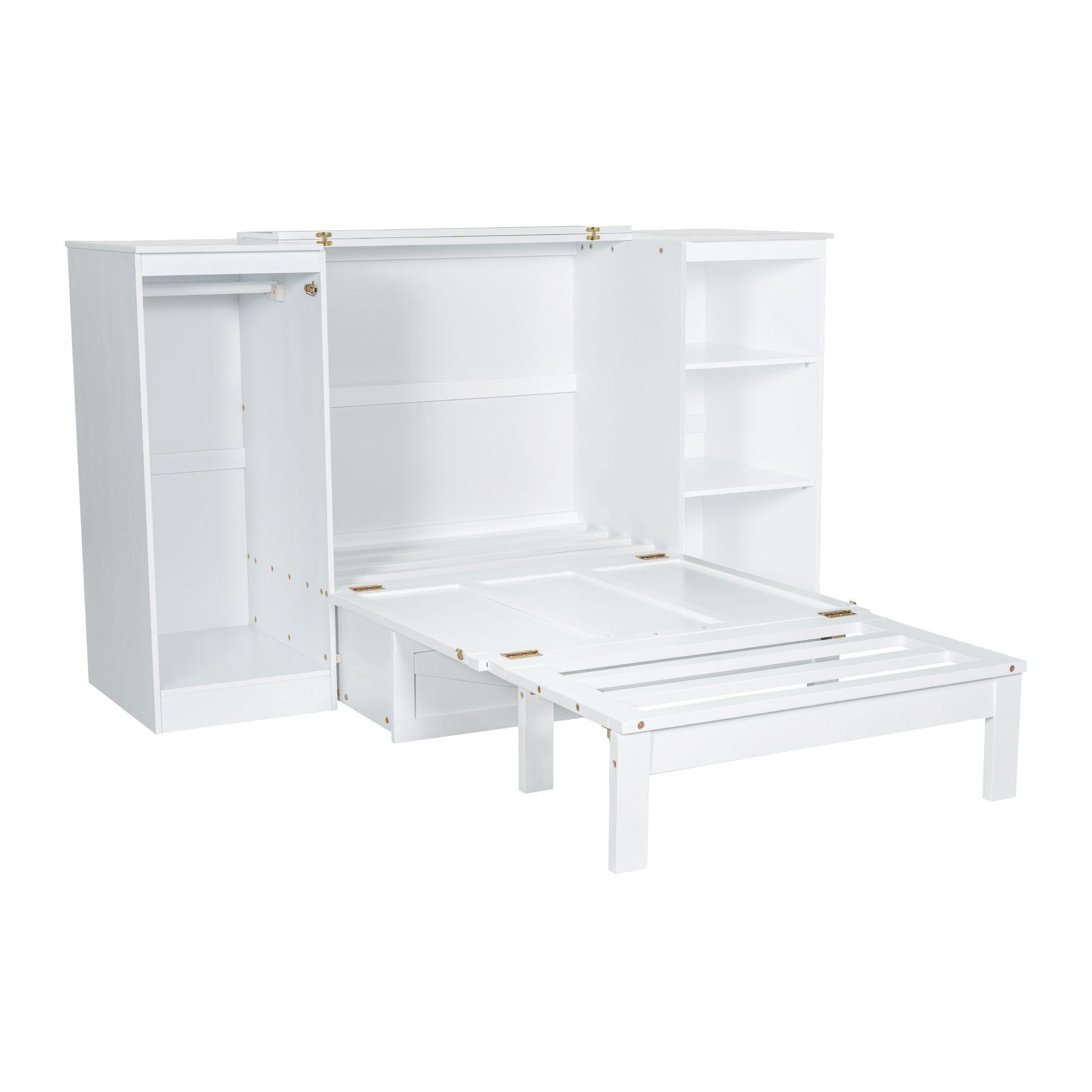 Twin Size Murphy Bed with Bedside Shelves and Wardrobe, White